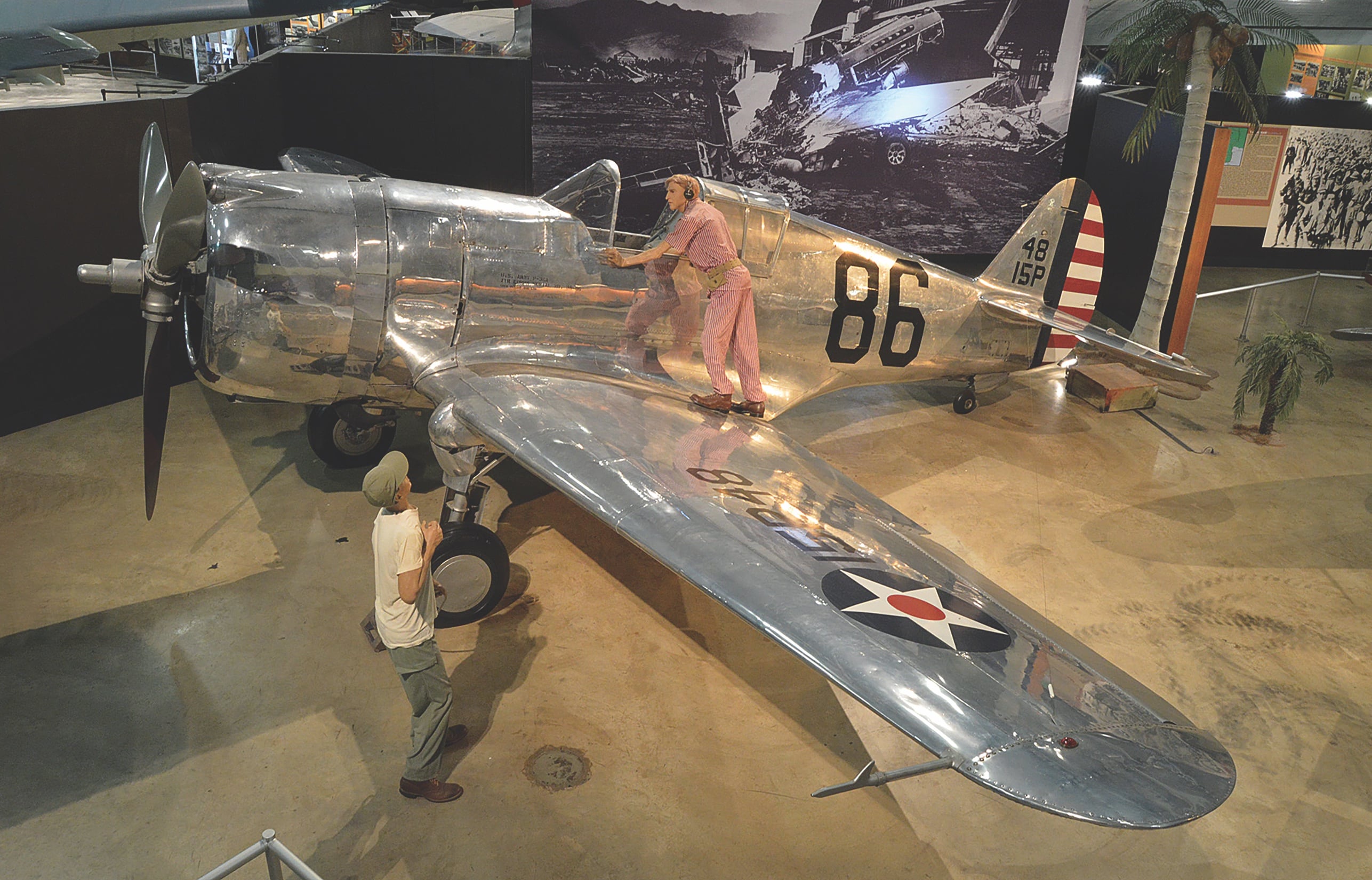 I wasn’t wasting any time because, as I was running down toward the flight line, I saw the airplanes were lined up wingtip to wingtip. And the Japanese had started to bomb and strafe the aircraft at the end of the line. Each airplane was exploding and igniting the one next to it because they were so close together. There were a few [Curtiss] P-36s that were closer to the hangar line, a little farther away from the other aircraft. And I ran down to one of those and jumped into that plane, got it started, and then an armorer came over with a belts of 30-caliber and 50-caliber ammunition on his shoulder, then jumped on the wing.